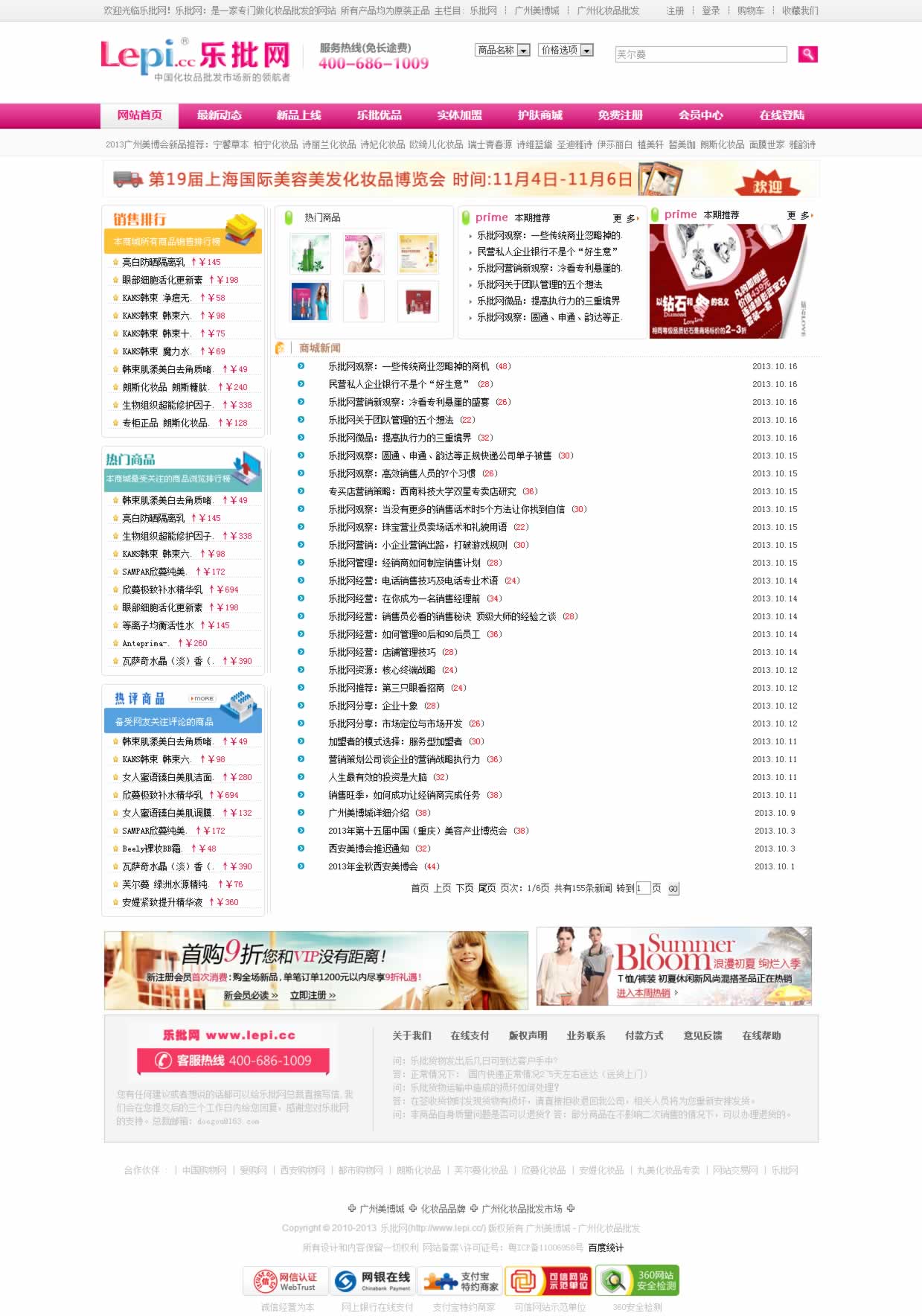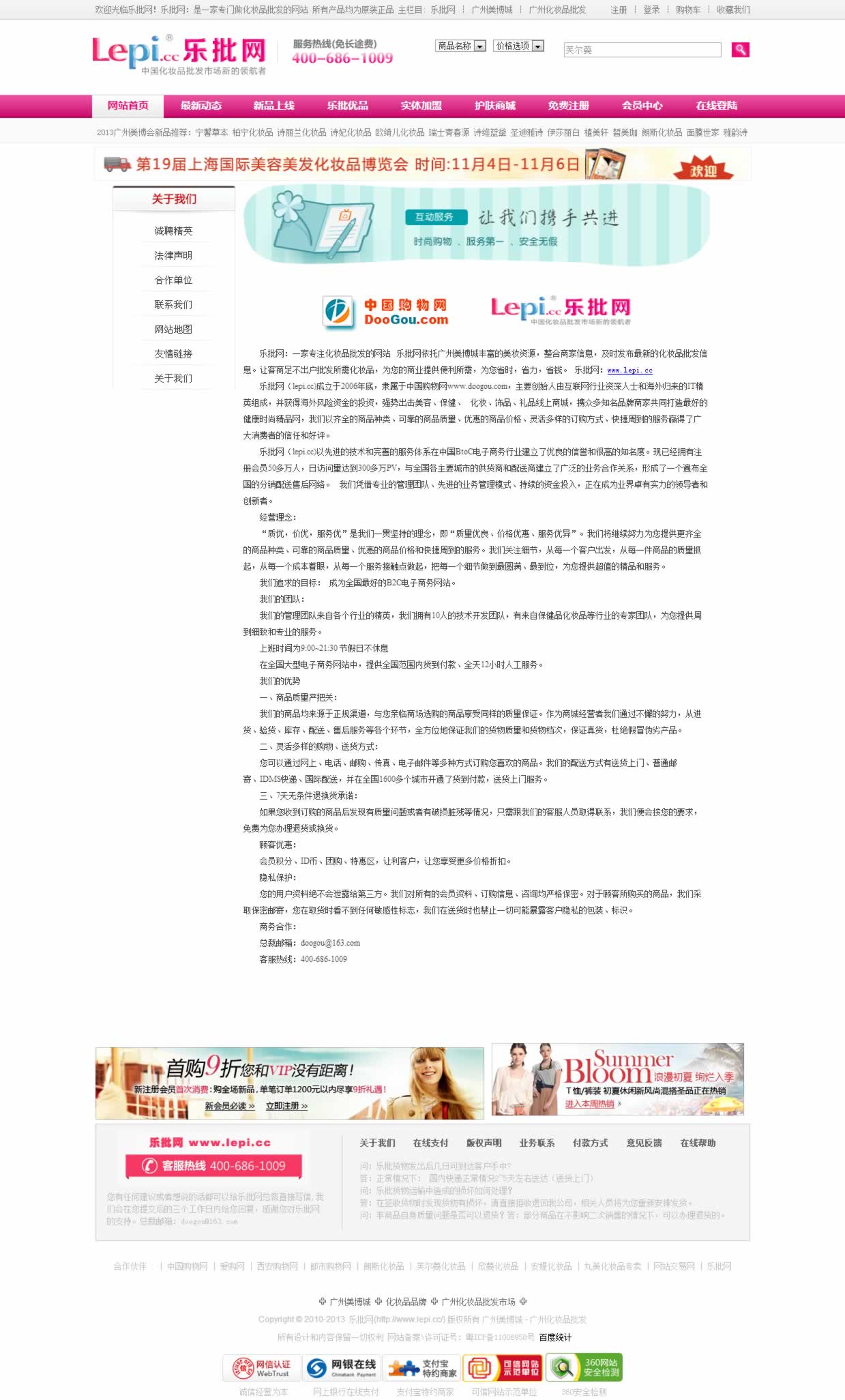 樂批網(wǎng)(lepi.cc)成立于2006年底,主要創(chuàng)始人由互聯(lián)網(wǎng)行業(yè)資深人士和海外歸來的IT精英組成,并獲得海外風(fēng)險(xiǎn)資金的投資,強(qiáng)勢出擊美容、保健、 化妝、飾品、禮品線上商城,攜眾多知名品牌商家共同打造最好的健康時(shí)尚精品網(wǎng),我們以齊全的商品種類、可靠的商品質(zhì)量、優(yōu)惠的商品價(jià)格、靈活多樣的訂購方式、快捷周到的服務(wù)贏得了廣大消費(fèi)者的信任和好評。